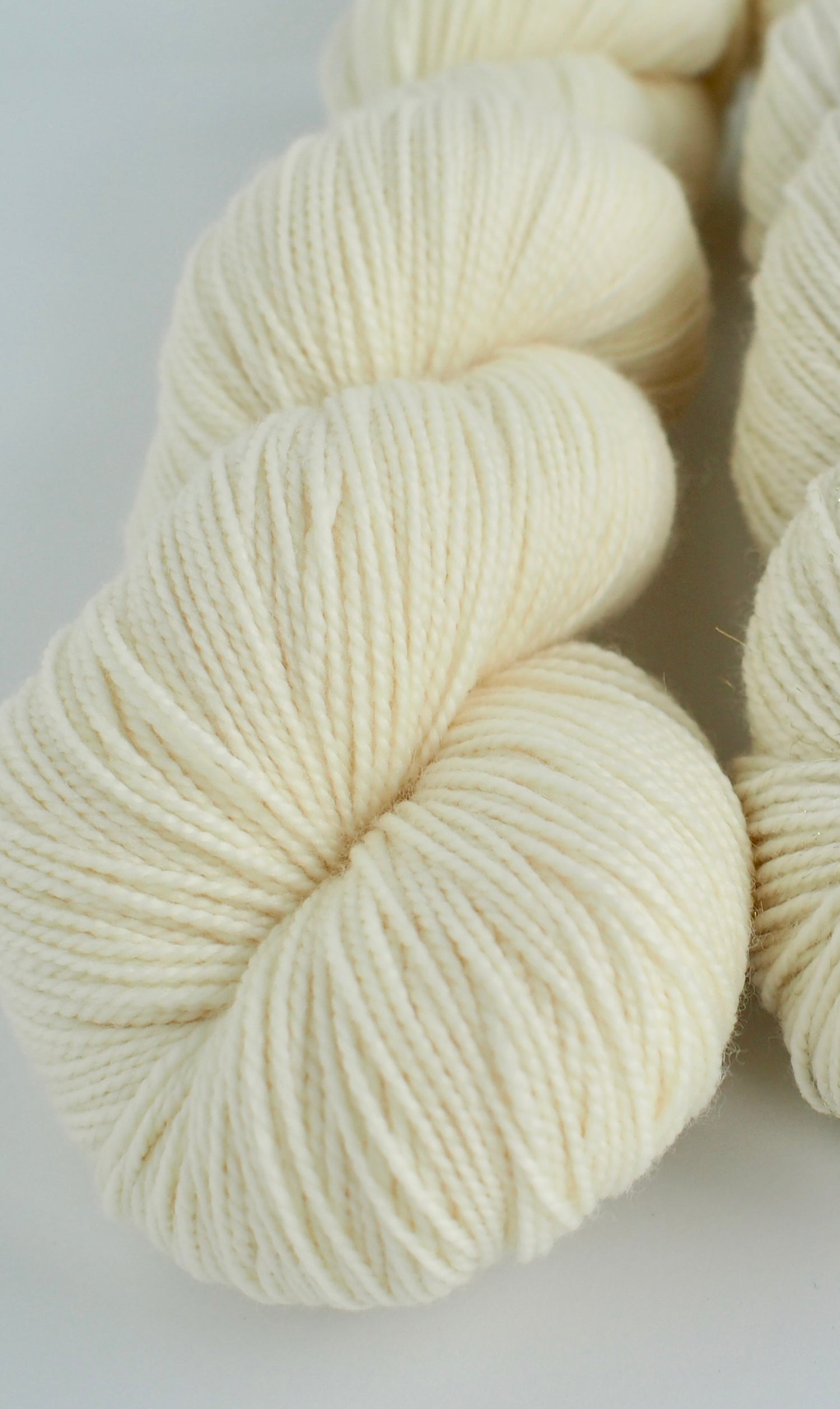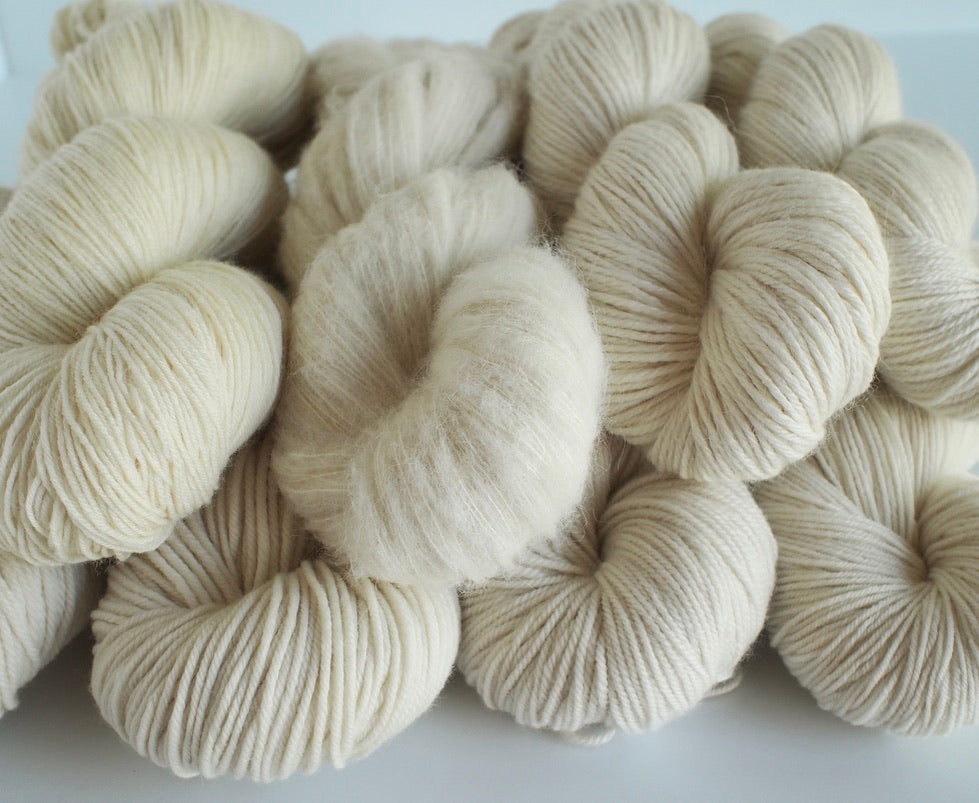 80% extra-fine superwash merino, 10% mulberry silk, 10% yak (white or gray)