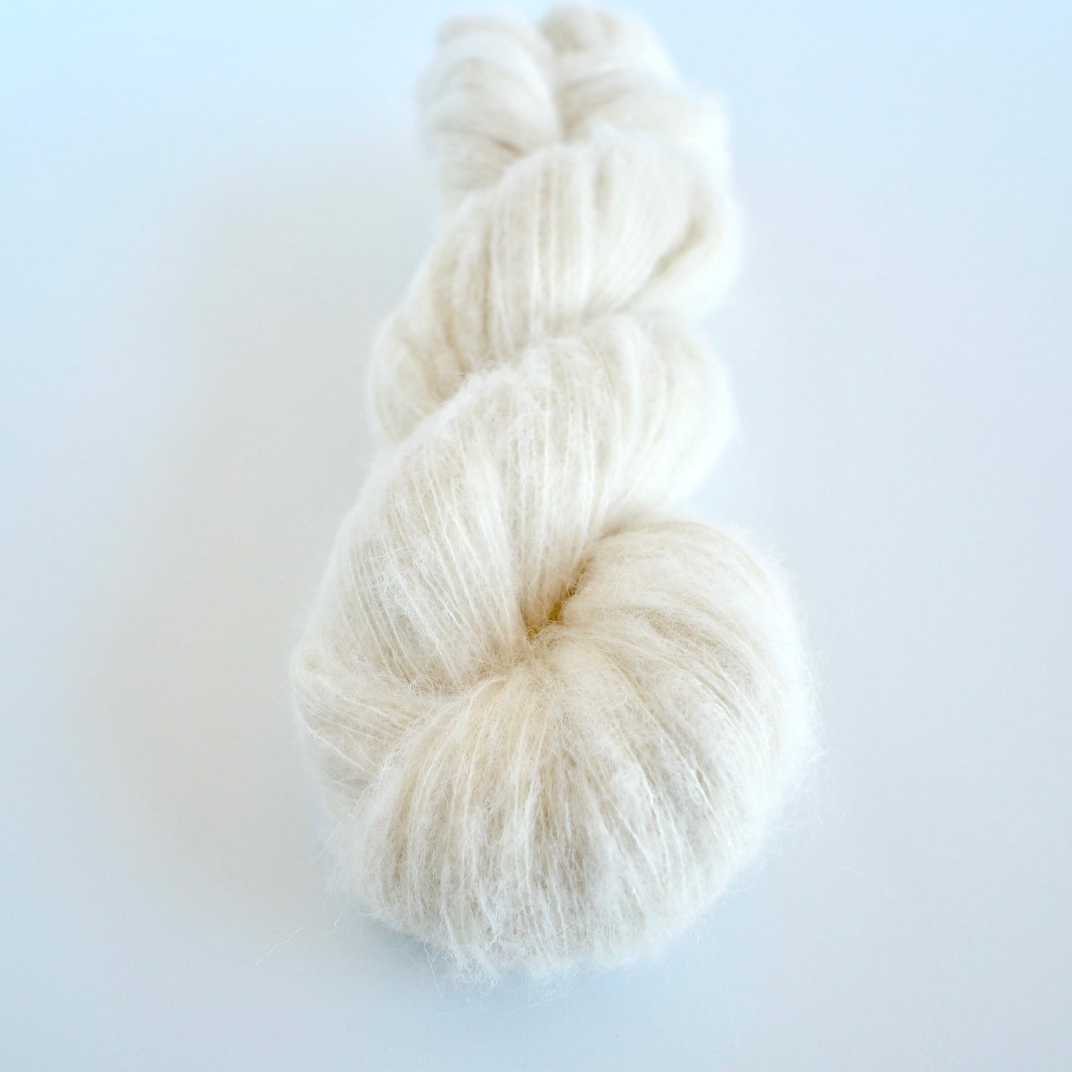 Suri Alpaca is a great alternative to mohair - it has the fluffy halo, a bit of shine due to the silk core, and all the warmth of the suri alpaca. This lace weight suri has a generous 459 yds in 50g, and pairs well if you hold it together with a fingering weight yarn. Some people find suri alpaca a tad less prickly compared to mohair.