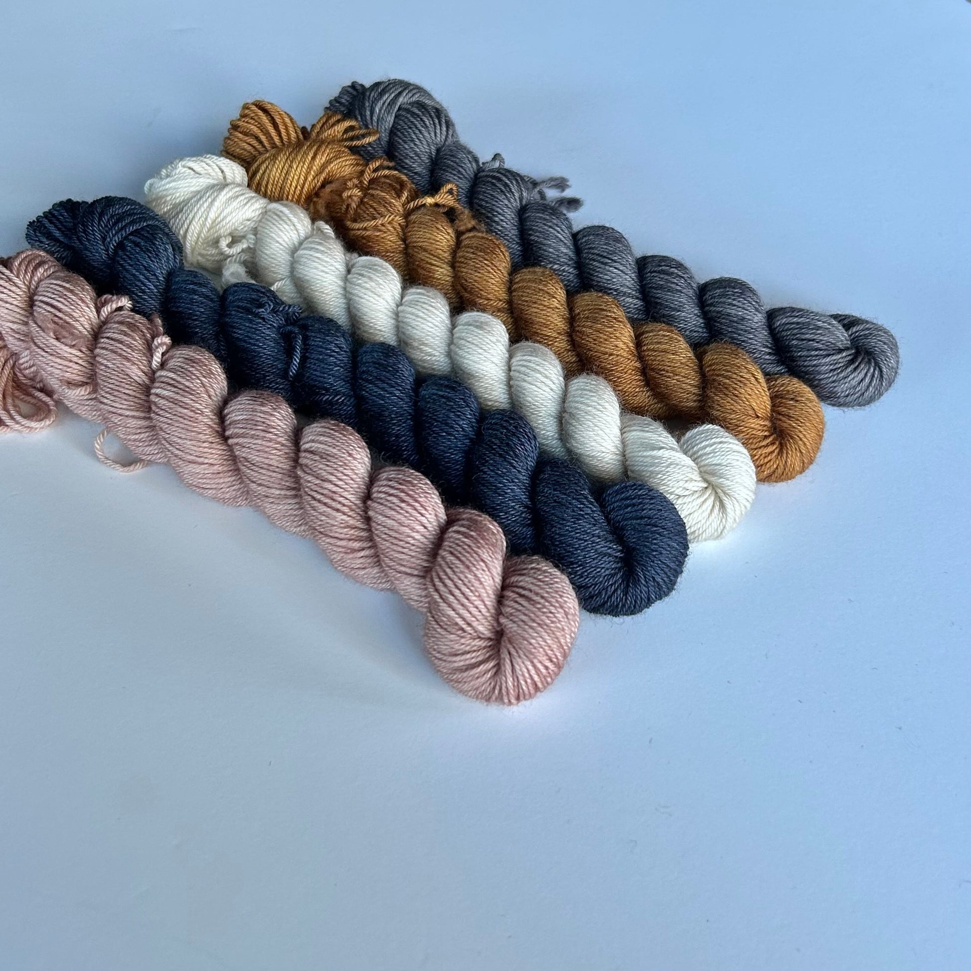 This mini-skein kit contains 5 perfect neutral shades: a barely-there sand, pinkish-beige, honey sepia, warm gray and a midnight blue. These 5 colors would make a fun stripey pair of socks, or a neutral palette for a color work project. A perfect pairing is Burnt Cherry - the berry tones contrast nicely with each of the neutrals in this set.