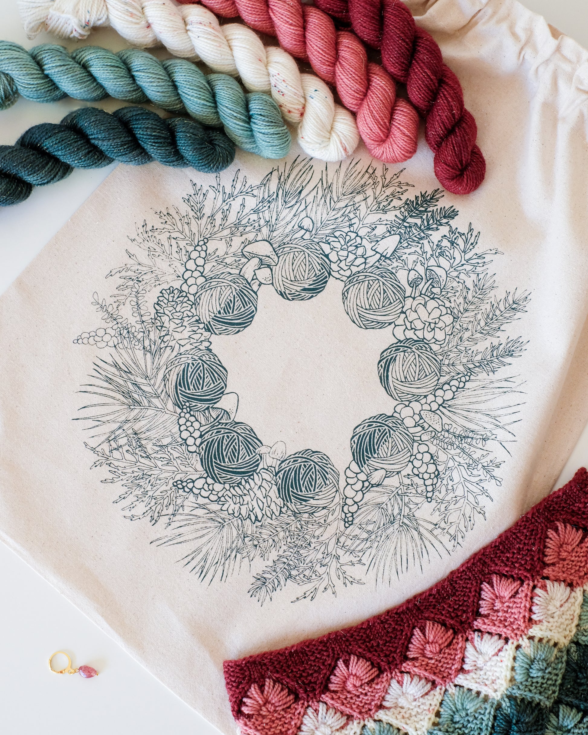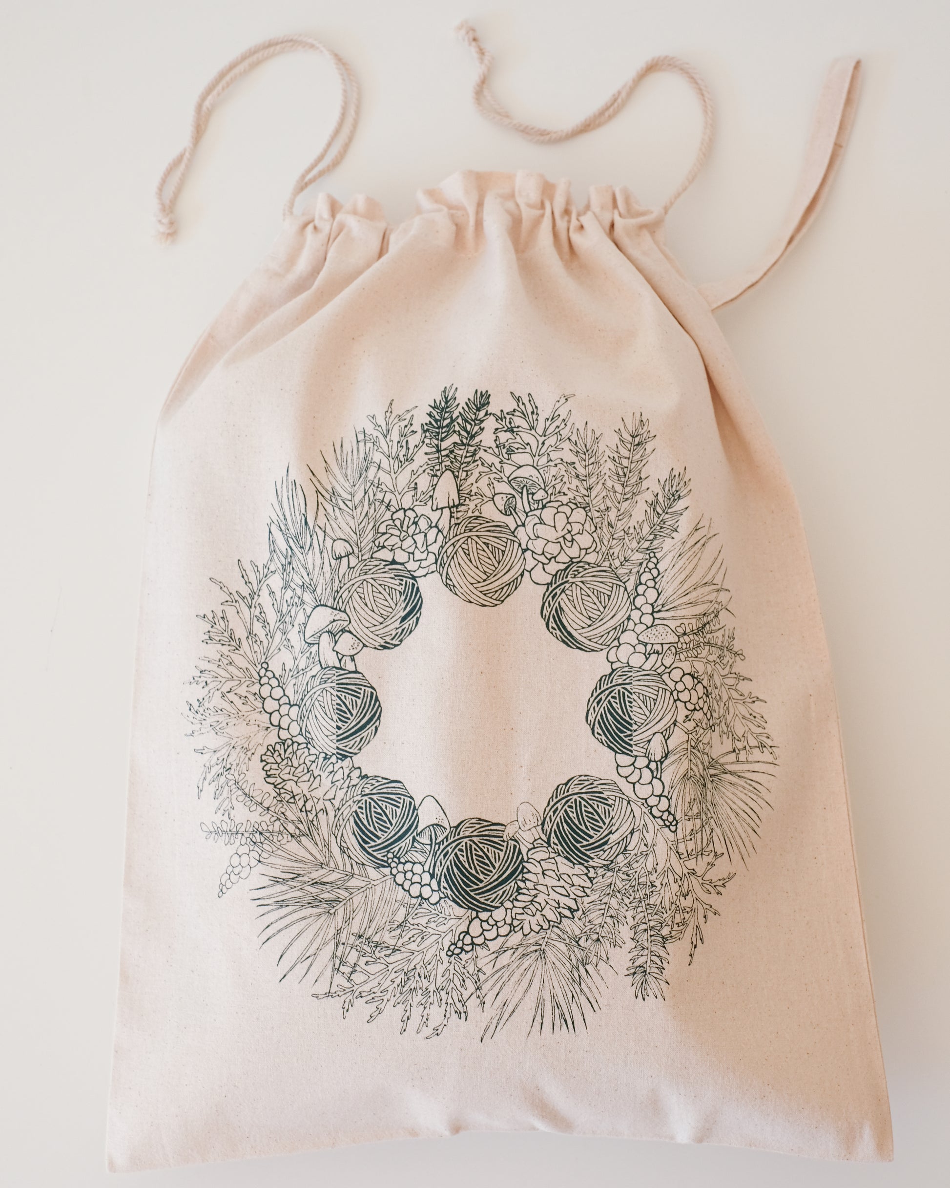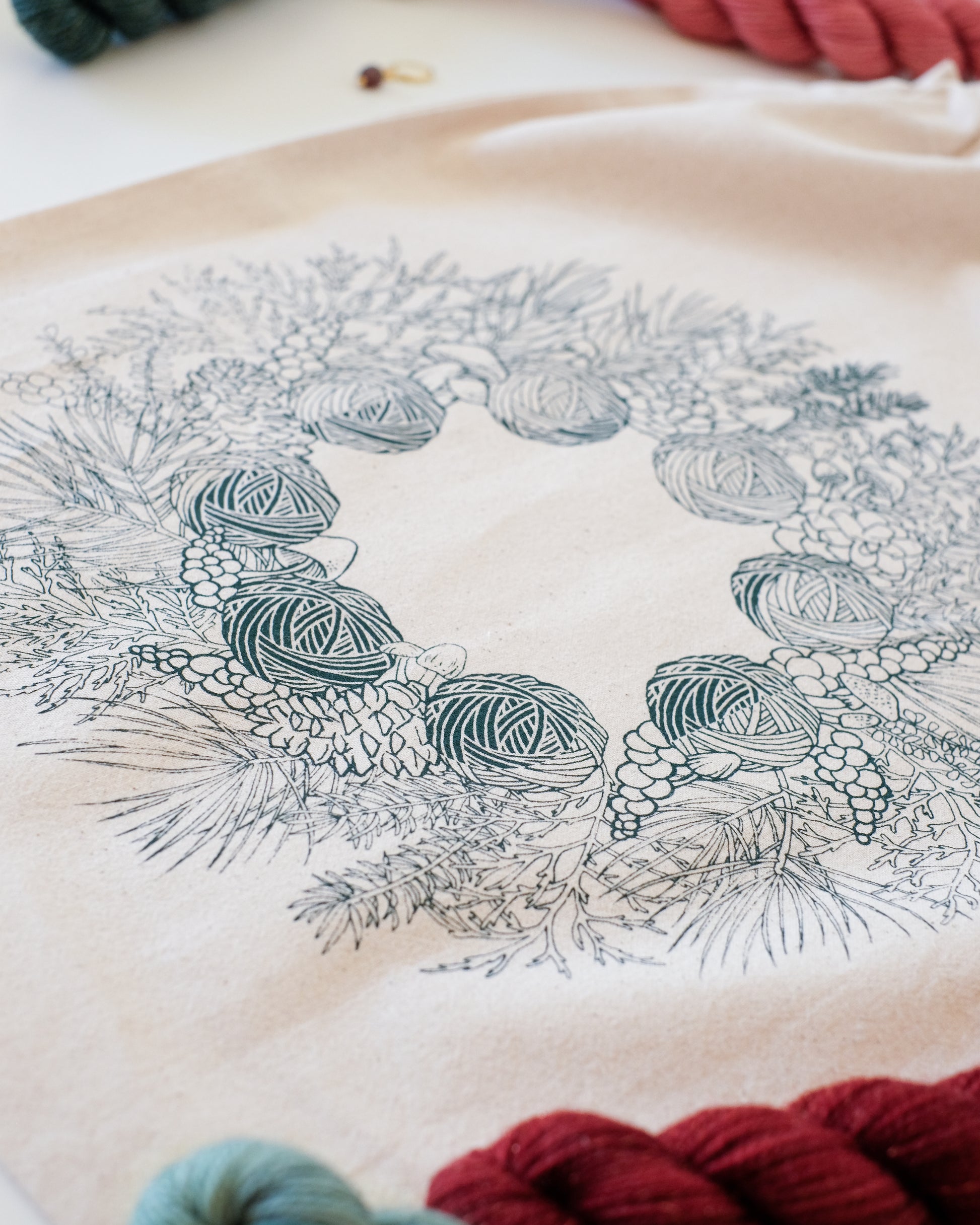 To carry your project in style, the kit includes an organic cotton project bag from Dawn Kathryn Studios, hand-printed in her Berkeley studio. Dawn's original artwork features evergreens and winter flora around the moon phases, celebrating the peaceful beauty of winter crafting.