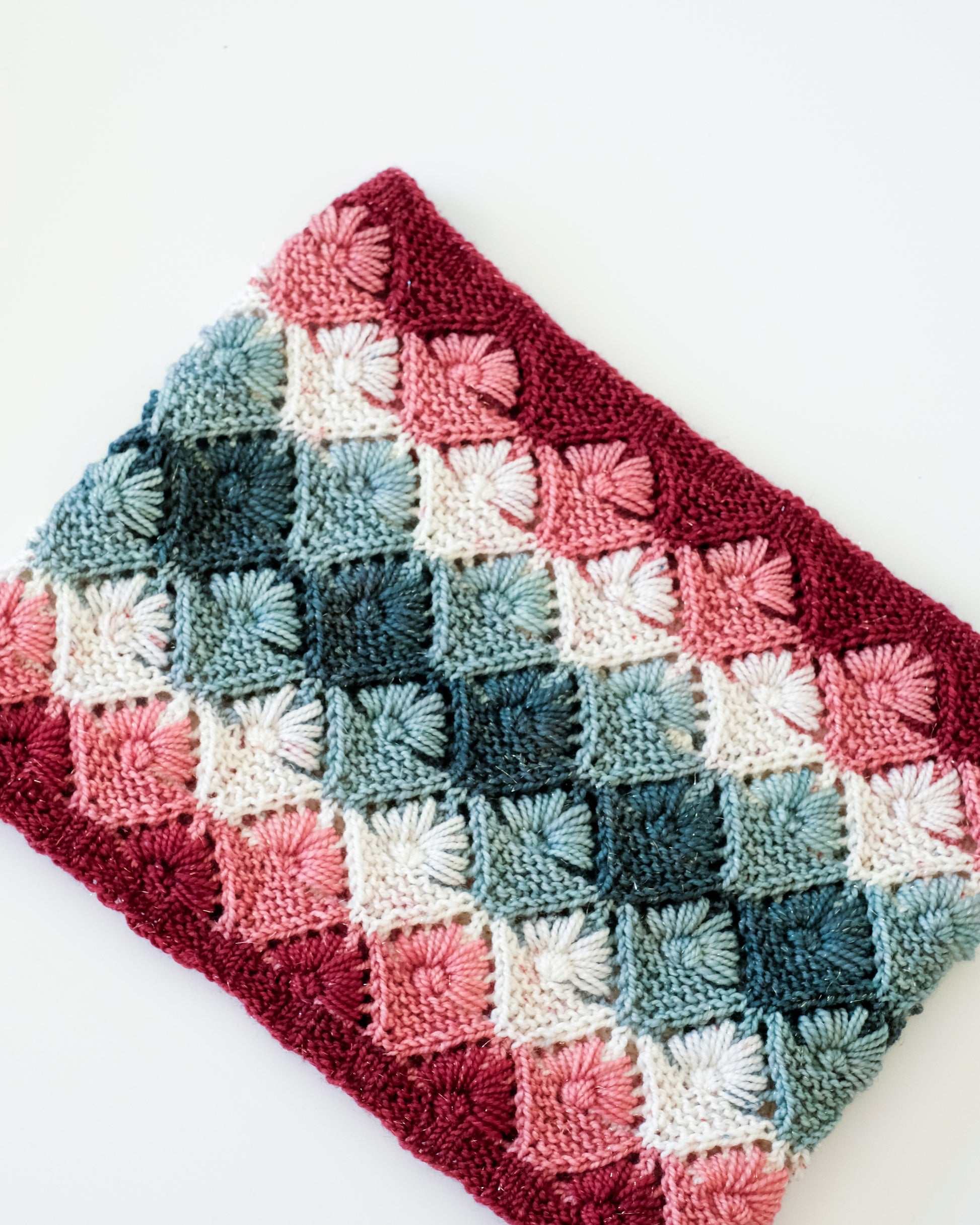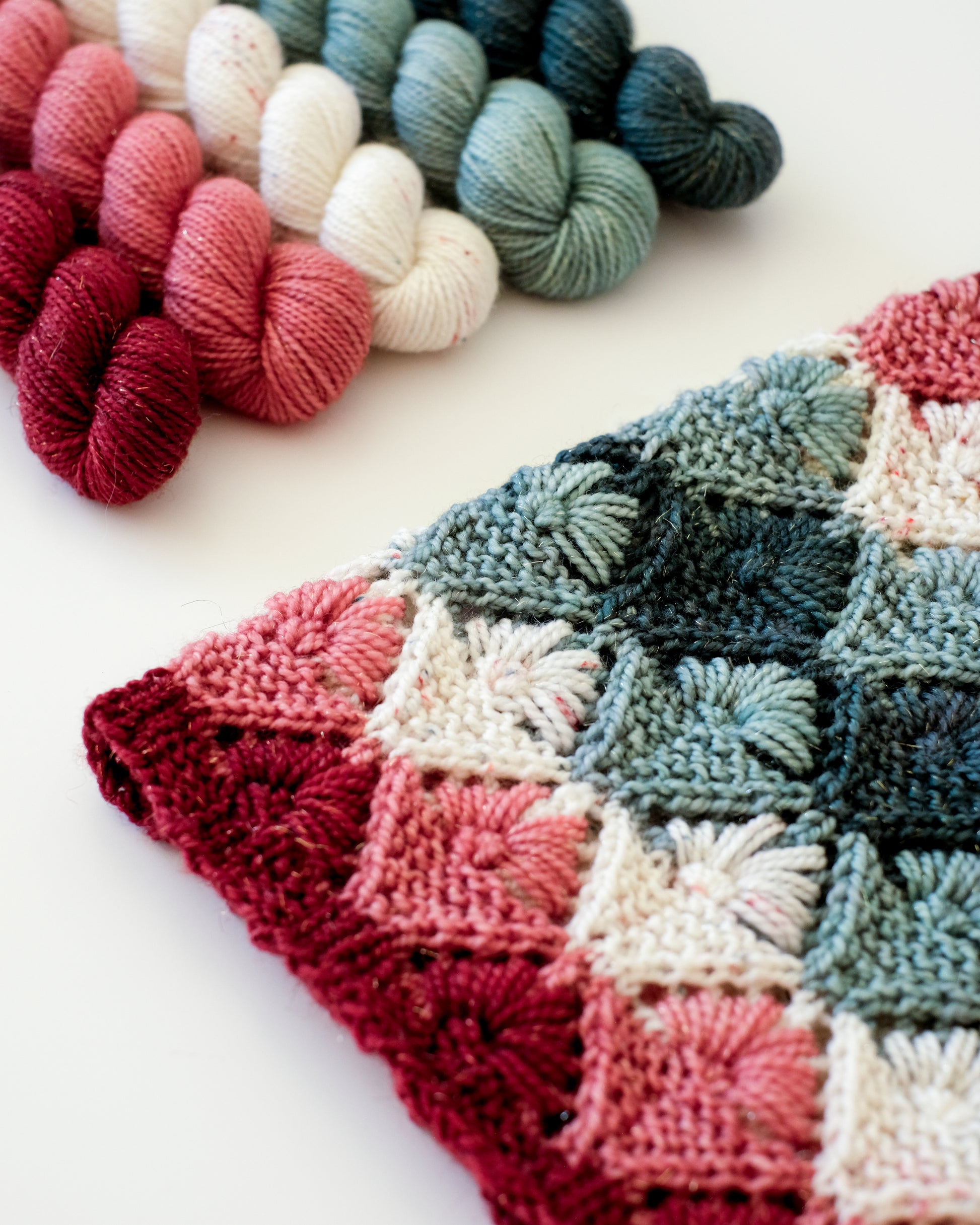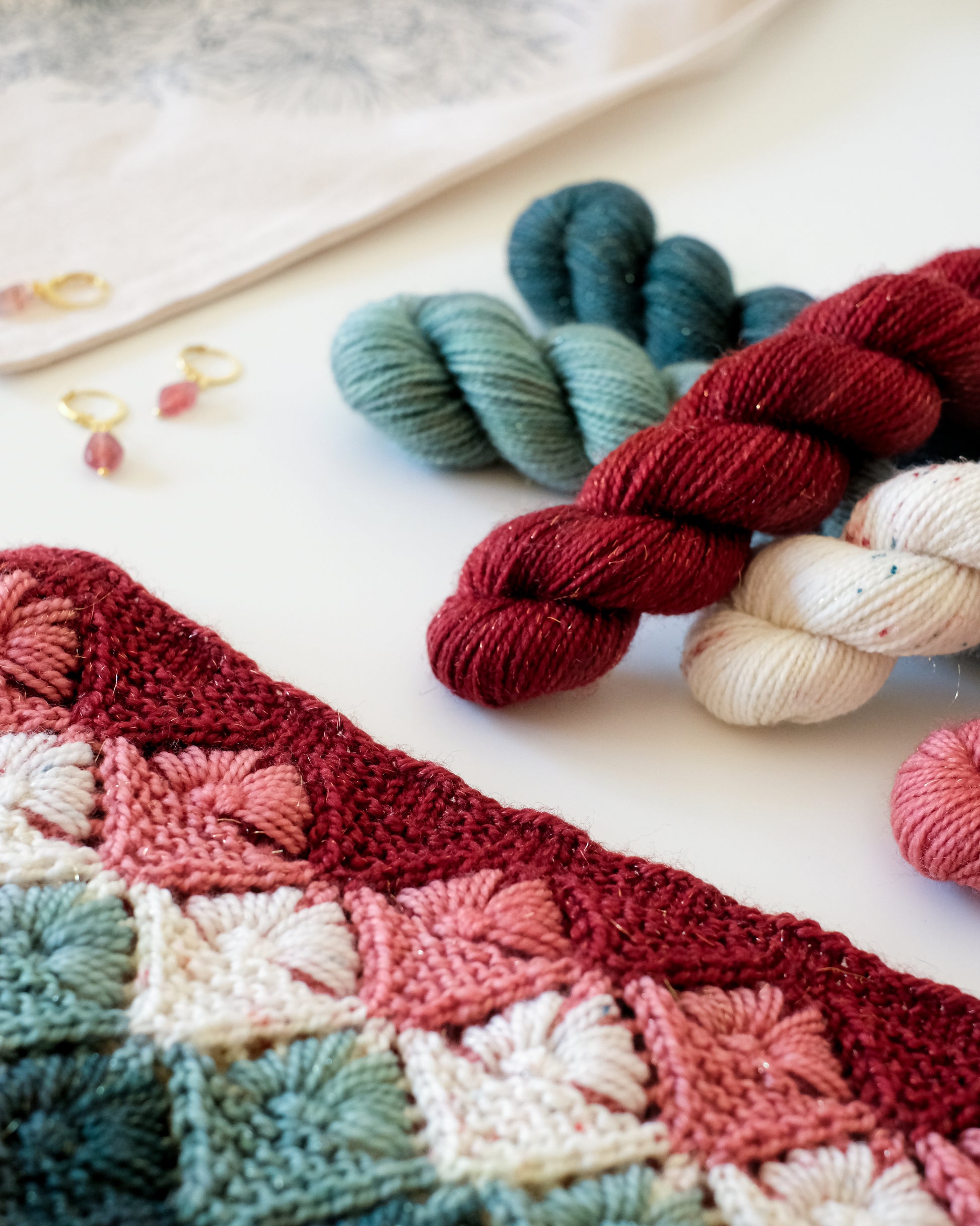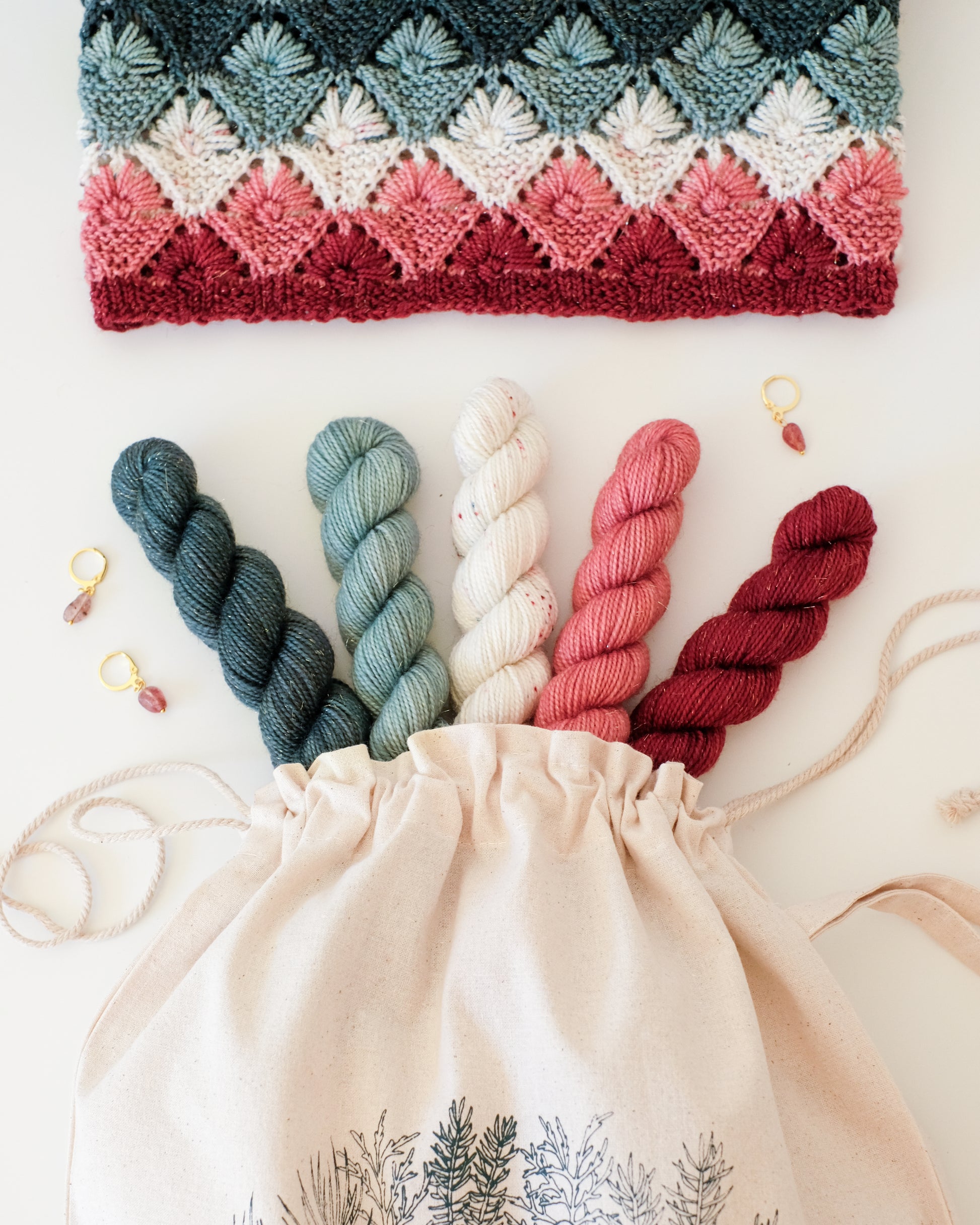 At the heart of the kit is the Cyclamen Cowl pattern, a new design by Ksenia Naidyon of Life Is Cozy. This elegant cowl captures the delicate magic of winter gardens, where cyclamen flowers unfurl, bright sparks of color in the quiet of the season. The flowers are created with dip stitches with just one color used in every row.