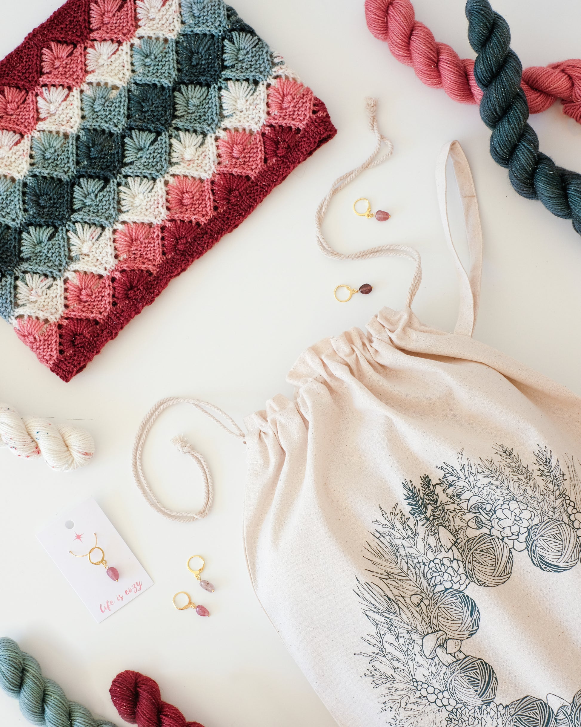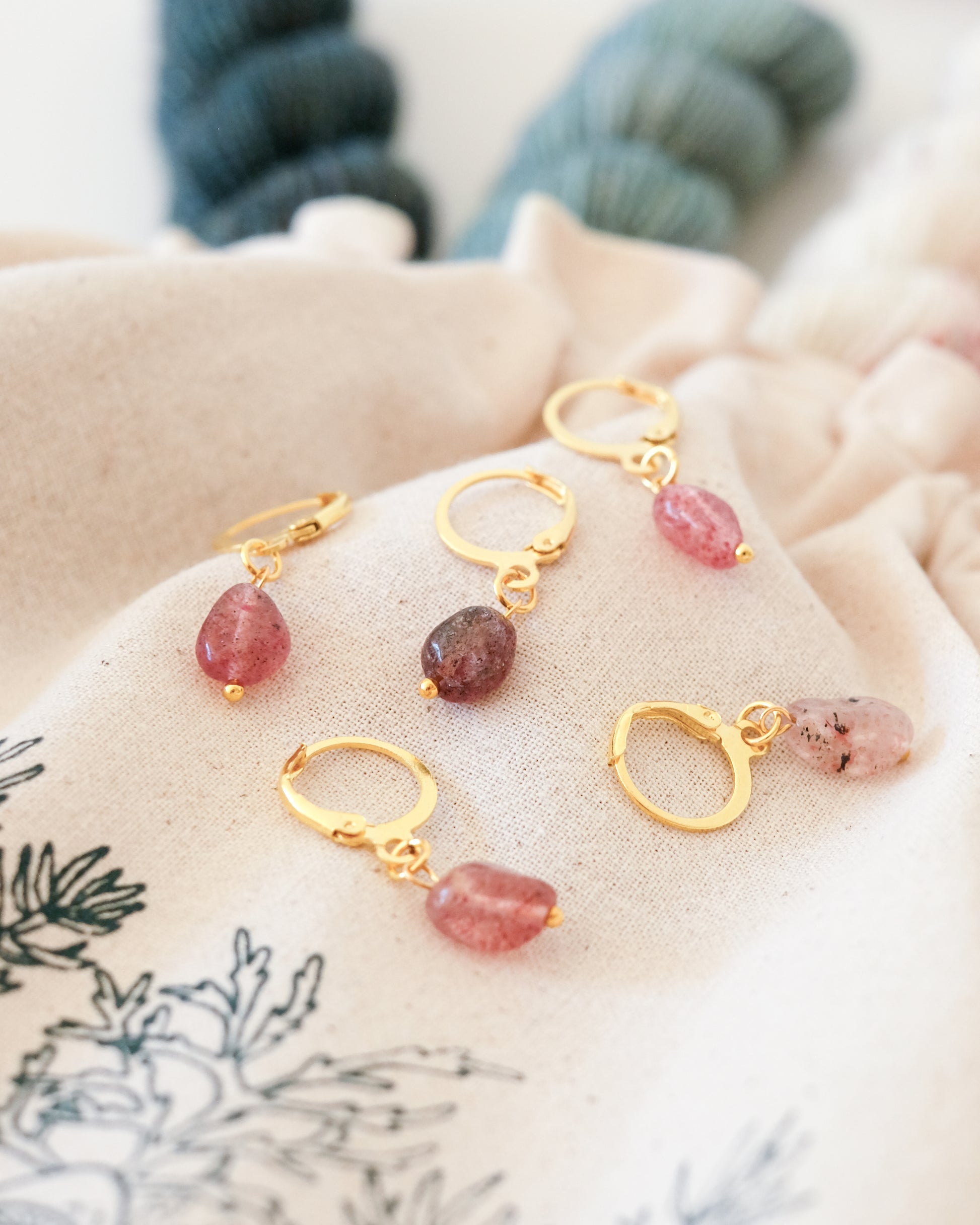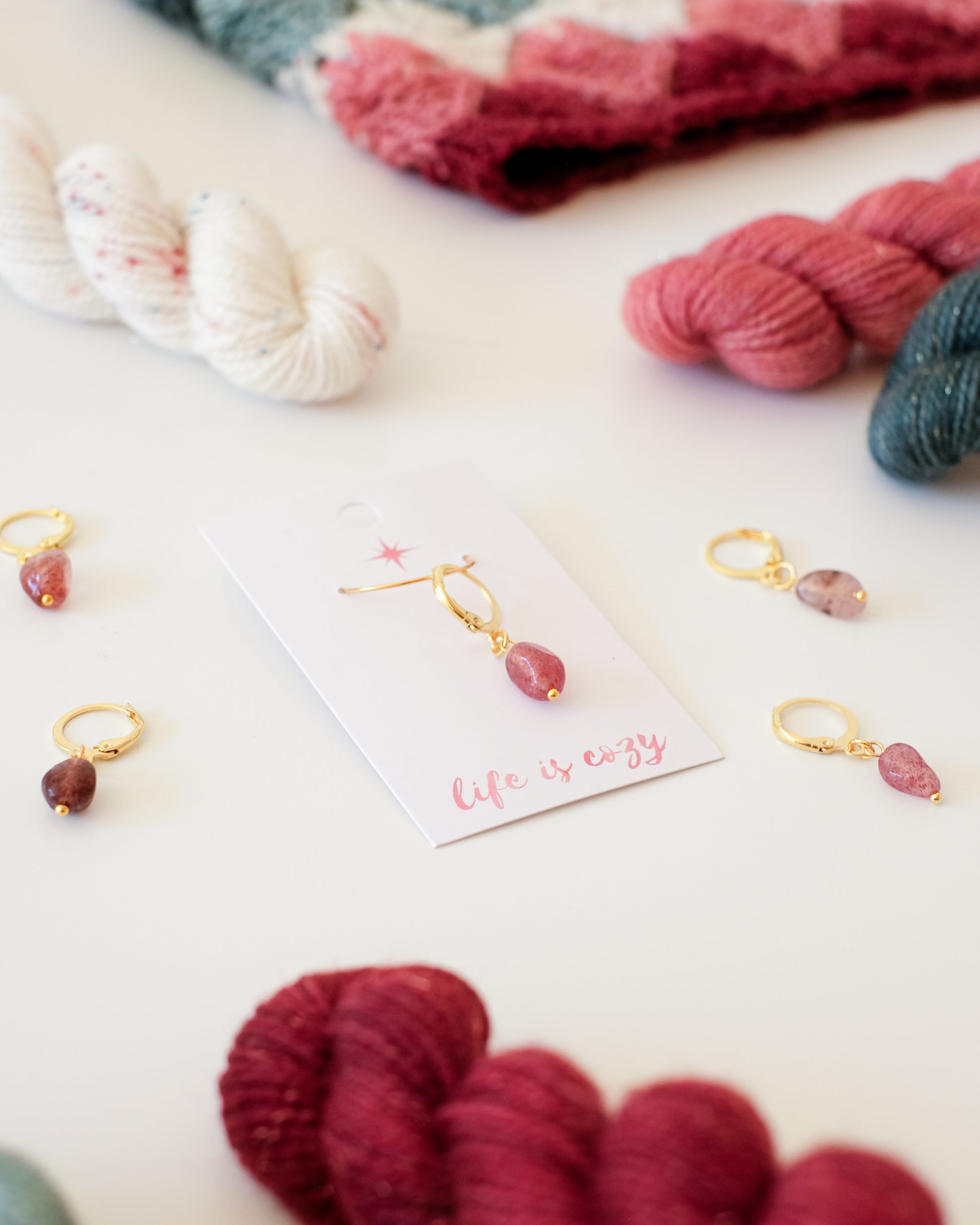 Each kit also includes a strawberry quartz stitch marker, handmade with love by Ksenia. Strawberry quartz is a symbol of inner joy, love, and self-acceptance, offering an extra touch of care during the colder months.