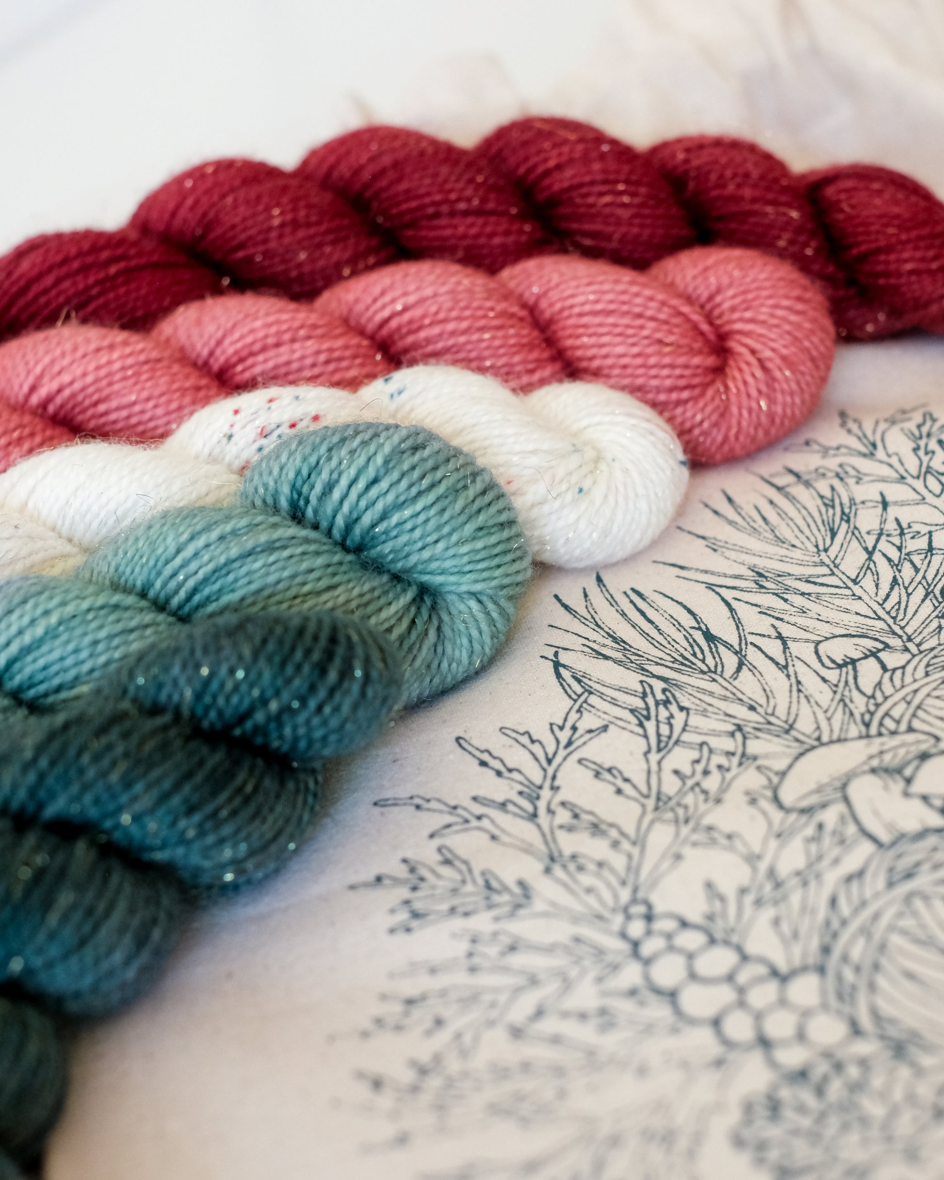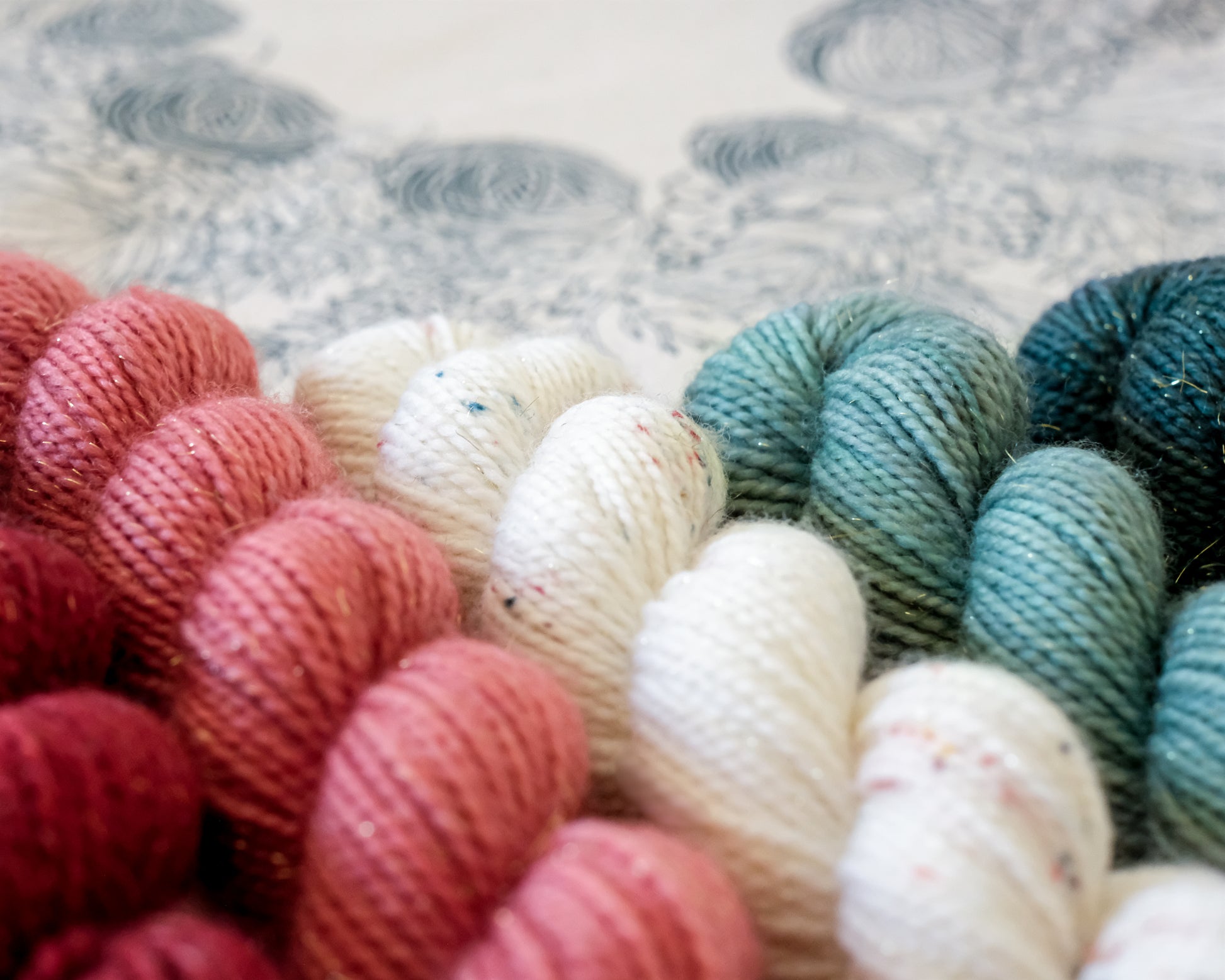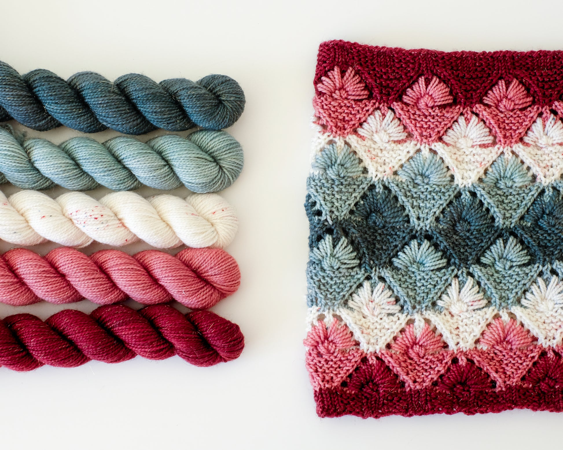 The kit’s exclusive yarn is a collection of five mini-skeins of enchanting Glitter Fingering. Dyed by Lynn Tsui of Peninsula Yarn, this blend of soft merino with golden shimmer evokes the beauty of frosty mornings and festive lights — perfect for bringing the Cyclamen Cowl’s intricate details to life.